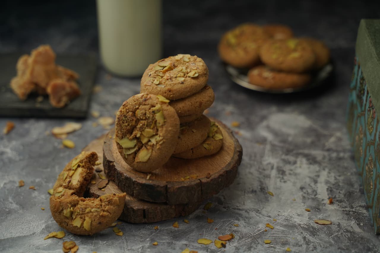 The deep, caramel-like sweetness of jaggery pairs beautifully with the richness of clarified butter (ghee), creating a warm aroma and satisfying texture in every bite. A balanced combination of whole wheat flour and rice flour ensures a crisp yet tender crunch, while premium pista slices add a subtle nutty flavor and an elegant finish.