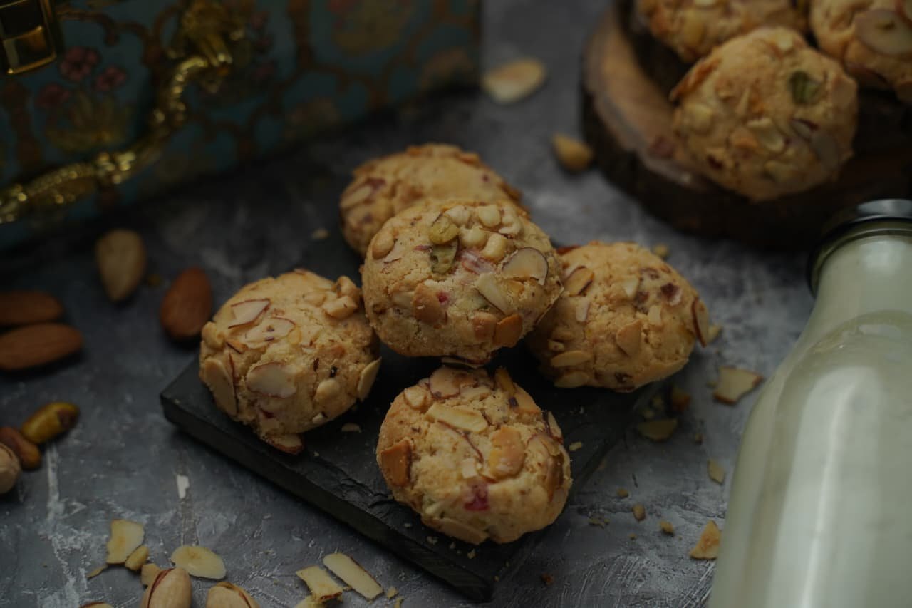 Baked to golden perfection using refined wheat flour, pure clarified butter, and a blend of quality ingredients, each cookie offers a melt-in-the-mouth texture with a satisfying crunch from handpicked dry fruits. The subtle sweetness and rich aroma make them perfect for serving with tea, coffee, or as a festive gift.
